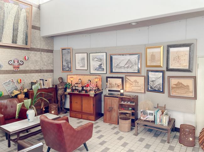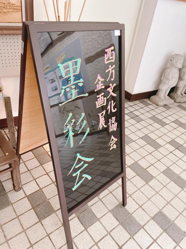 壁面は、西方地域で活動する芸術団体「墨彩会」の焼き絵や水墨画を同時展示しています。