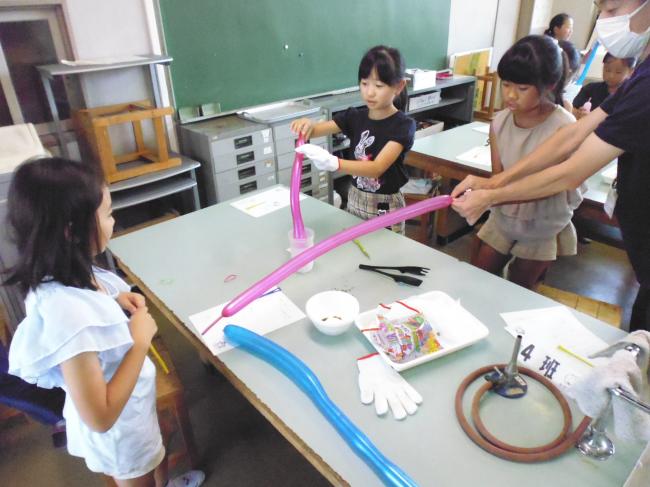 液体の温度が-196℃であること、気体に戻ると体積が約700倍にもなることを、風船の実験などを通して体感しました。