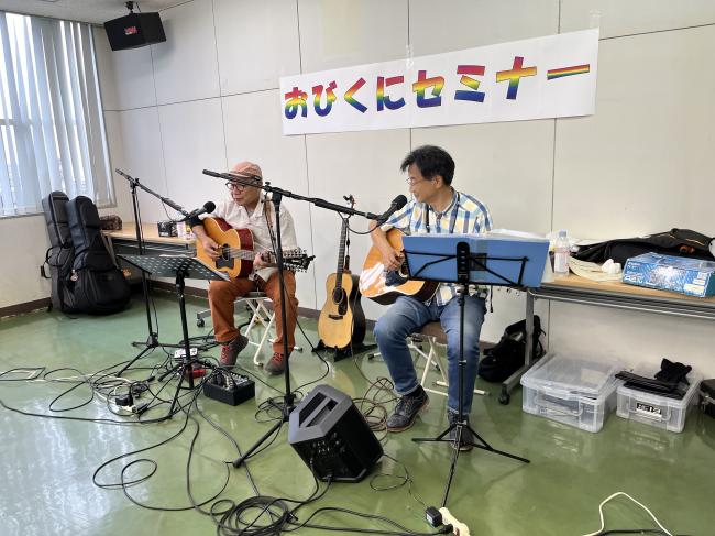 おびくにセミナーの初回は、川島宗竹先生&松島和巳先生をお招きして「フォークソング・ギターライブ」を開催しました。