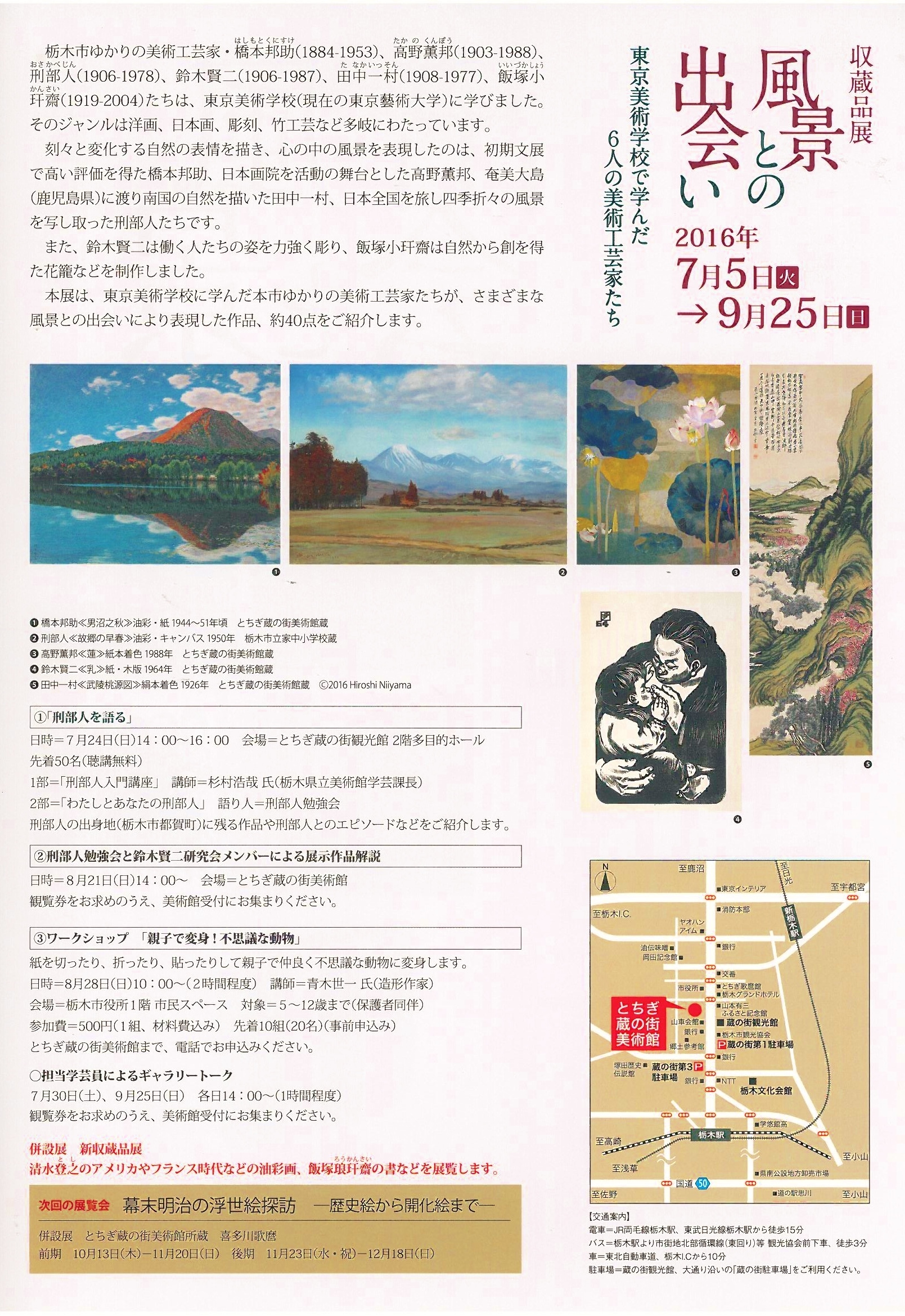 栃木市ゆかりの美術工芸家・橋本邦助(1884-1953)、高野薫邦(1903-1988)、刑部人(1906-1978)、鈴木賢二(1906-1987)、田中一村(1908-1977)、飯塚小玕齋(1919-2004)たちは、東京美術学校(現在の東京藝術大学)に学びました。そのジャンルは洋画、日本画、彫刻、竹工芸など多岐にわたっています。刻々と変化する自然の表情を描き、心の中の風景を表現したのは、初期文展において高い評価を得た橋本邦助、日本画院を活動の舞台とした高野薫邦、奄美大島(鹿児島県)に渡り南国の自然を静謐に描いた田中一村、日本全国を巡り四季折々の風景を写し取った刑部人たちです。
