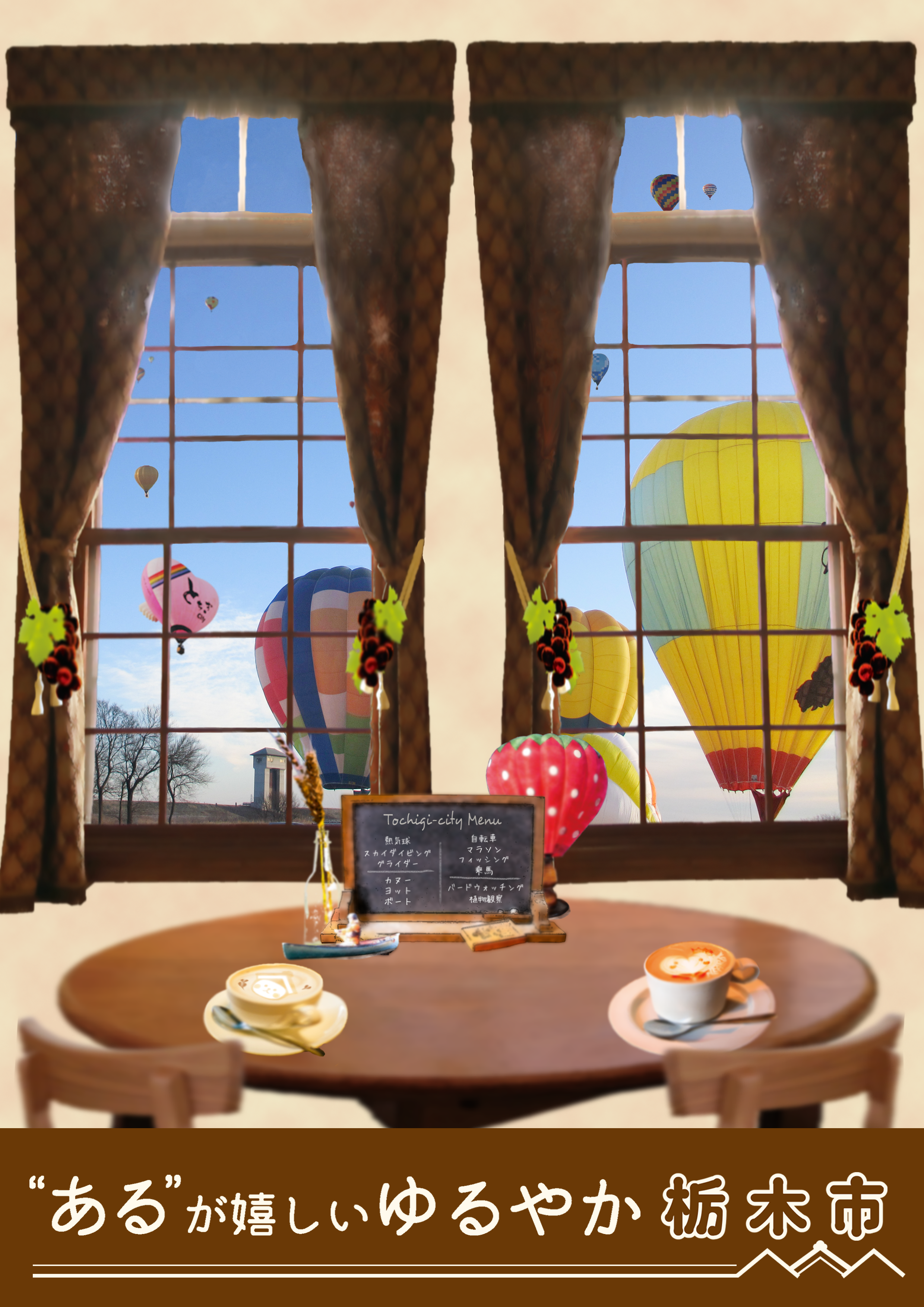 窓から栃木市の景色をのんびりと眺める、そんなイメージで制作したポスター(2種)です。 和室の窓は、岡田記念館別邸 翁島 にあるもの。洋室の窓は、塚田歴史伝説館 にあるものを使用しています。