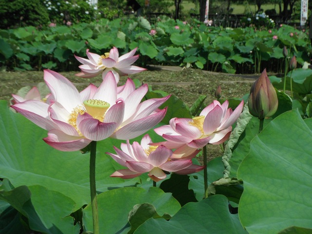 つがの里ではハスが花開き、色鮮やかに初夏を彩ります。可憐な花を是非一度ご覧ください。なお、ハスは朝早くに花開き、正午を過ぎた頃には花が閉じてしまいますので、午前中の来園をおすすめいたします。また、同時期にはスイレンやアジサイも園内を彩ります。