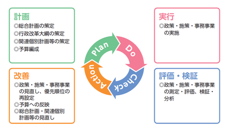 「栃木市マネジメントサイクル」により、総合計画に位置付けられた政策・施策・事務事業が予定どおり実施されたかどうか、その効果が実現または達成されたかどうかについて評価を行い、その結果を今後の取組内容や予算編成に反映させていきます。