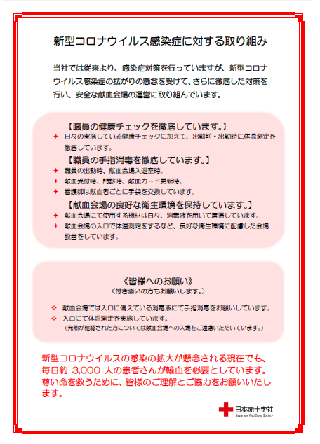 新型コロナウイルスの感染が拡大されている現在でも、毎日約3,000人の患者さんが輸血を必要としています。尊い命を救うために、皆様のご理解とご協力をお願いいたします。