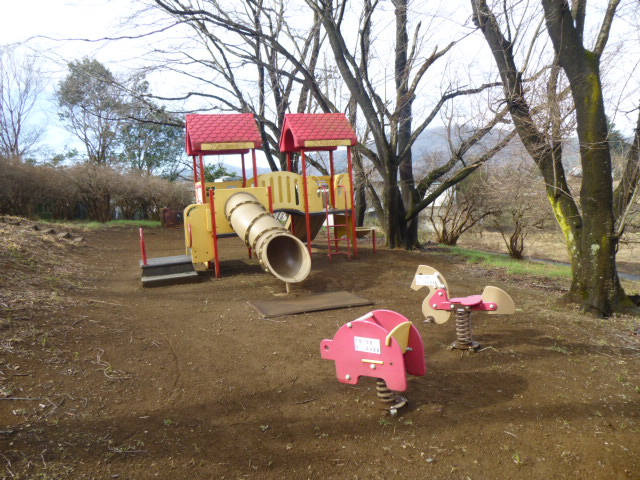 小高い山の公園で、複合遊具、斜面のすべり面、土管のトンネルなどの遊具があり、頂上にはベンチや藤棚のある見晴らしの良い公園です。