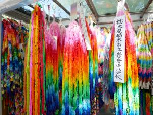 原爆の子の像は、年間を通してたくさんの千羽鶴が捧げられていることから、別名「千羽鶴の塔」とも呼ばれています。千羽鶴は日本国内をはじめ、世界各国からも奉納されています。各中学校で作製した千羽鶴ととちぎ平和展等で市民の皆さんに作っていただいた折り鶴で作製した千羽鶴を平和への願いを込めて奉納しました。千羽鶴の作製にご協力いただき、ありがとうございました。